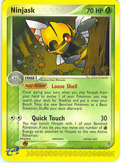 Type | Grass | Pokemon serie | Dragon | Stadie | Stage 1 | HP | 70 | Sjældenhed | Rare | Svaghed | R | Kortnummer | 18 | Evne | [CC] Quick Touch (30) You may switch Ninjask with 1 of your Benched Pokemon. If you do, you may move any number of G Energy cards attached to Ninjask to the new Active Pokemon. | Evne2 | [CC] Quick Touch (30) You may switch Ninjask with 1 of your Benched Pokemon. If you do, you may move any number of G Energy cards attached to Ninjask to the new Active Pokemon. | Kunstner | Hajime Kusajima |