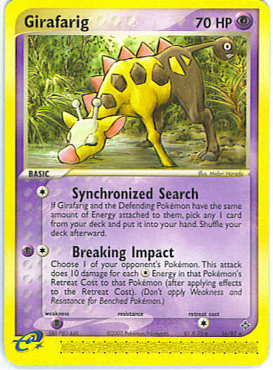 Evne[C] Synchronized Search - If Girafarig and the Defending Pokemon have the same amount of Energy attached to them, pick any 1 card from your deck and put it into your hand. Shuffle your deck afterward.