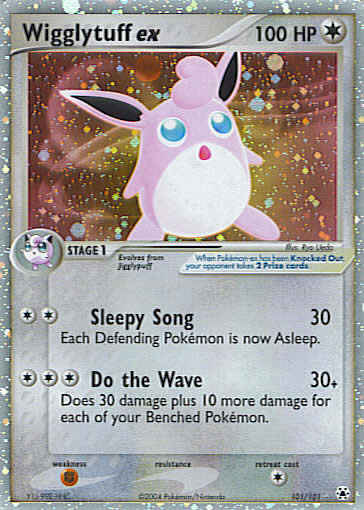 Type | Colorless | Pokemon serie | Hidden Legends | Stadie | Stage 1 | HP | 100 | Sjældenhed | Ultra-Rare | Tilbagetrækning | 1 | Svaghed | F | Kortnummer | 101 | Evne | [CC] Sleepy Song (30) Each Defending Pokemon is now Asleep. [CCC] Do the Wave (30+) Does 30 damage plus 10 more damage for each of your Benched Pokemon. | Evne2 | [CC] Sleepy Song (30) Each Defending Pokemon is now Asleep. [CCC] Do the Wave (30+) Does 30 damage plus 10 more damage for each of your Benched Pokemon. | Kunstner | Ryo Ueda |