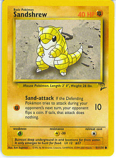 Evne [F] Sand-attack (10) If the Defending Pokemon tries to attack during your opponent's next turn, your opponent flips a coin. If tails, this attack does nothing.