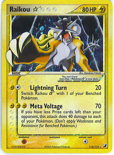 Type | Lightning | Pokemon serie | Unseen Forces | Stadie | Basic | HP | 80 | Sjældenhed | Ultra-Rare | Tilbagetrækning | 1 | Svaghed | F | Kortnummer | 114 | Evne |