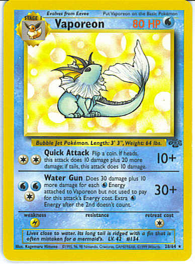 Type | Water | Pokemon serie | Jungle | Stadie | Stage 1 | HP | 80 | Sjældenhed | Rare | Tilbagetrækning | 1 | Svaghed | L | Kortnummer | 28 | Evne |