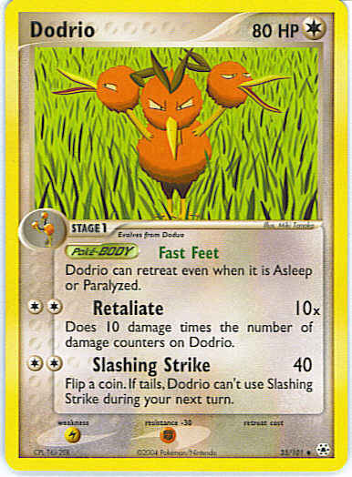 Type | Colorless | Pokemon serie | Hidden Legends | Stadie | Stage 1 | HP | 80 | Sjældenhed | Uncommon | Modstand | F | Svaghed | L | Kortnummer | 33 | Evne | [CC] Retaliate (10x) Does 10 damage times the number of damage counters on Dodrio. [CC] Slashing Strike (40) Flip a coin. If tails, Dodrio can't use Slashing Strike during your next turn. | Evne2 | [CC] Retaliate (10x) Does 10 damage times the number of damage counters on Dodrio. [CC] Slashing Strike (40) Flip a coin. If tails, Dodrio can't use Slashing Strike during your next turn. | Kunstner | Miki Tanaka |
