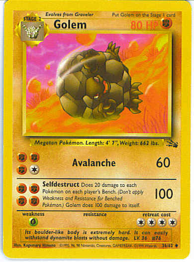 [FFFF] Selfdestruct (100) Does 20 damage to each Pokemon on each player's Bench. (Don't apply Weakness and Resistance for Benched Pokemon.) Golem does 100 damage to itself.