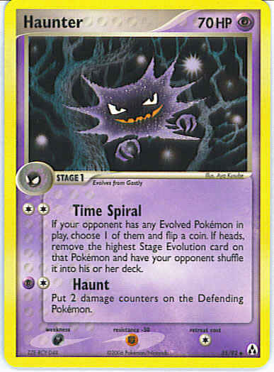 Type | Psychic | Pokemon serie | Legend Maker | Stadie | Stage 1 | HP | 70 | Sjældenhed | Uncommon | Tilbagetrækning | 1 | Modstand | F | Svaghed | D | Kortnummer | 35 | Evne | [CC] Time Spiral - If your opponent has any Evolved Pokemon in play, choose 1 of them and flip a coin. If heads, remove the highest Stage Evolution card on the Pokemon and have your opponent shuffle it into his or her deck. [CP] Haunt - Put 2 damage counters on the Defending Pokemon. | Evne2 | [CC] Time Spiral - If your opponent has any Evolved Pokemon in play, choose 1 of them and flip a coin. If heads, remove the highest Stage Evolution card on the Pokemon and have your opponent shuffle it into his or her deck. [CP] Haunt - Put 2 damage counters on the Defending Pokemon. | Kunstner | Aya Kusube |