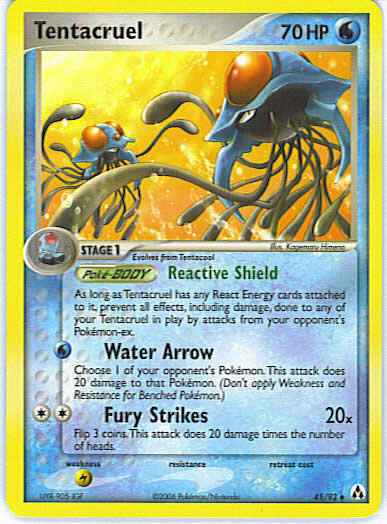 Type | Water | Pokemon serie | Legend Maker | Stadie | Stage 1 | HP | 70 | Sjældenhed | Uncommon | Svaghed | L | Kortnummer | 45 | Evne | , including damage, done to any of your Tentacruel in play by attacks from your opponent's Pokemon-ex. (Poke-BODY)
