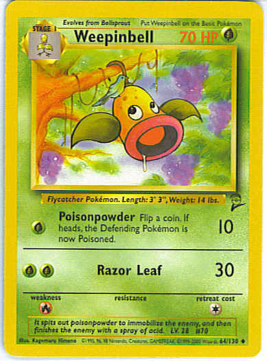 Type | Grass | Pokemon serie | Base Set 2 | Stadie | Stage 1 | HP | 70 | Sjældenhed | Uncommon | Tilbagetrækning | 1 | Svaghed | R | Kortnummer | 64 | Evne |