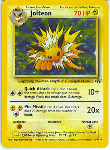 Type | Lightning | Pokemon serie | Jungle | Stadie | Stage 1 | HP | 70 | Sjældenhed | Rare | Tilbagetrækning | 1 | Svaghed | F | Kortnummer | 4 | Evne |
