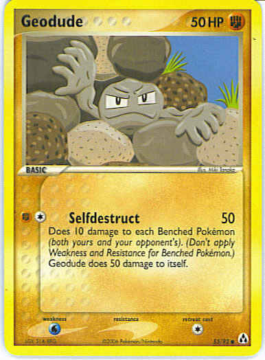 Evne2[CF] Selfdestruct (50) Does 10 damage to each Benched Pokemon (both yours and your opponent's). (Don't apply Weakness and Resistance for Benched Pokemon.) Geodude does 50 damage to itself.