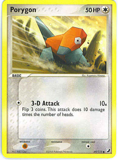 Type | Colorless | Pokemon serie | Unseen Forces | Stadie | Basic | HP | 50 | Sjældenhed | Common | Tilbagetrækning | 1 | Svaghed | F | Kortnummer | 69 | Evne | [C] 3-D Attack (10x) Flip 3 coins. This attack does 10 damage times the number of heads. | Evne2 | [C] 3-D Attack (10x) Flip 3 coins. This attack does 10 damage times the number of heads. | Kunstner | Kagemaru Himeno |