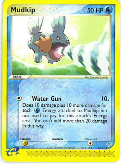 Type | Water | Pokemon serie | Dragon | Stadie | Basic | HP | 50 | Sjældenhed | Common | Tilbagetrækning | 1 | Svaghed | L | Kortnummer | 65 | Evne | [C] Water Gun (10+) Does 10 damage for each W Energy attached to Mudkip but not used to pay for this attack's Energy cost. You can't add more than 20 damage in this way. | Evne2 | [C] Water Gun (10+) Does 10 damage for each W Energy attached to Mudkip but not used to pay for this attack's Energy cost. You can't add more than 20 damage in this way. | Kunstner | Hironobu Yoshida |