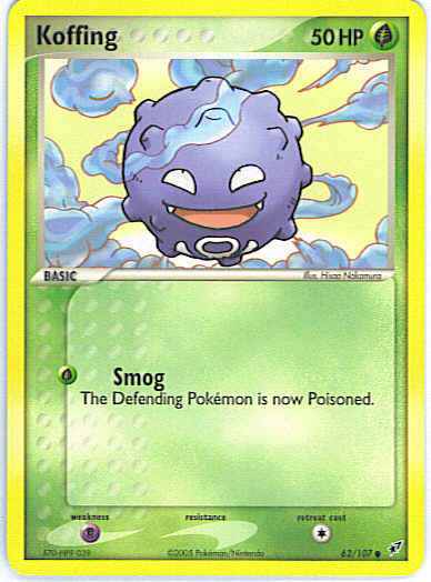 Type | Grass | Pokemon serie | Deoxys | Stadie | Basic | HP | 50 | Sjældenhed | Common | Tilbagetrækning | 1 | Svaghed | P | Kortnummer | 62 | Evne | [G] Smog - The Defending Pokemon is now Poisoned. | Evne2 | [G] Smog - The Defending Pokemon is now Poisoned. | Kunstner | Hisao Nakamura |