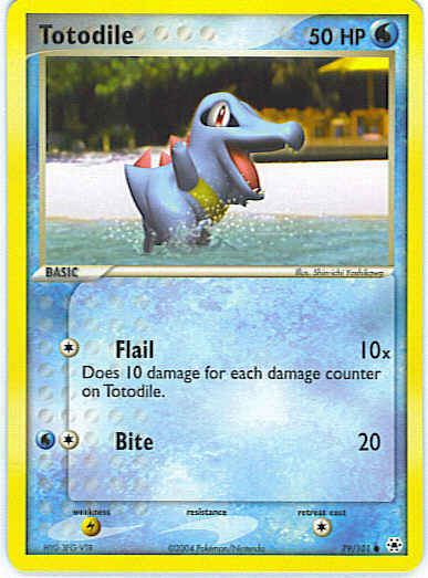Type | Water | Pokemon serie | Hidden Legends | Stadie | Basic | HP | 50 | Sjældenhed | Common | Tilbagetrækning | 1 | Svaghed | L | Kortnummer | 79 | Evne | [C] Flail (10x) Does 10 damage for each damage counter on Totodile. [CW] Bite (20) | Evne2 | [C] Flail (10x) Does 10 damage for each damage counter on Totodile. [CW] Bite (20) | Kunstner | Shin-ichi Yoshikawa |