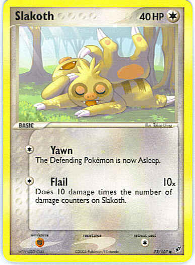 Type | Colorless | Pokemon serie | Deoxys | Stadie | Basic | HP | 40 | Sjældenhed | Common | Tilbagetrækning | 1 | Svaghed | F | Kortnummer | 73 | Evne | [C] Yawn - The Defending Pokemon is now Asleep. [C] Flail (10x) Does 10 damage times the number of damage counters on Slakoth. | Evne2 | [C] Yawn - The Defending Pokemon is now Asleep. [C] Flail (10x) Does 10 damage times the number of damage counters on Slakoth. | Kunstner | Takao Unno |