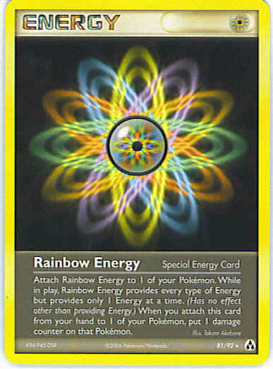 Attach Rainbow Energy to 1 of your Pokemon. While in play, Rainbow Energy provides every type of energy but provides only 1 energy at a time. (Has no effect other than providing energy.) When you attach this card from your hand to 1 of your Pokemon, put 1 damage counter on that Pokemon.