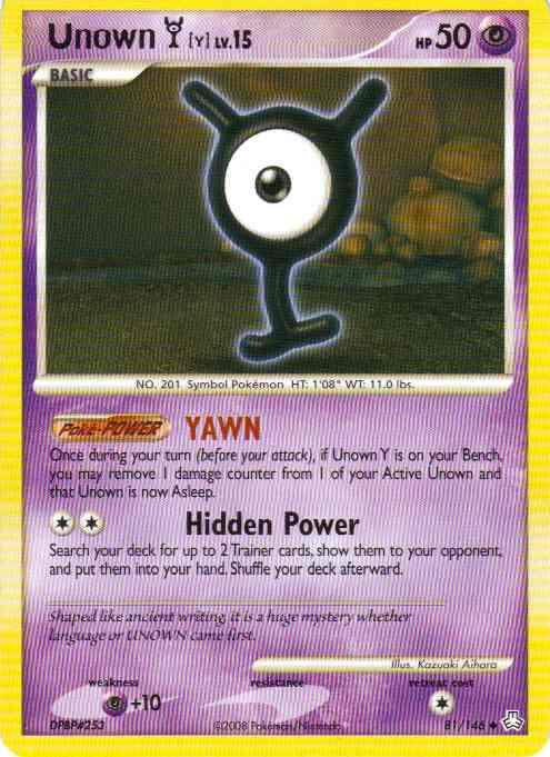 Type | Psychic | Pokemon serie | Legends Awakened | Stadie | Basic | HP | 50.0 | Sjældenhed | Uncommon | Tilbagetrækning | 1.0 | Svaghed | P+10 | Kortnummer | 81 | Evne | [CC] Hidden Power - Search your deck for up to 2 Trainer cards, show them to your opponent, and put them into your hand. Shuffle your deck afterward.