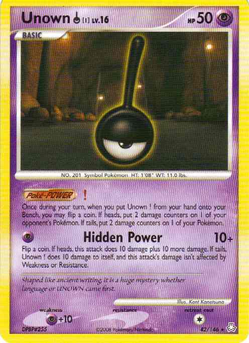 Evne2 [P] Hidden Power (10+) Flip a coin. If heads, this attack does 10 damage plus 10 more damage. If tails, Unown ! does 10 damage to itself, and this attack's damage isn't affected by Weakness or Resistance.