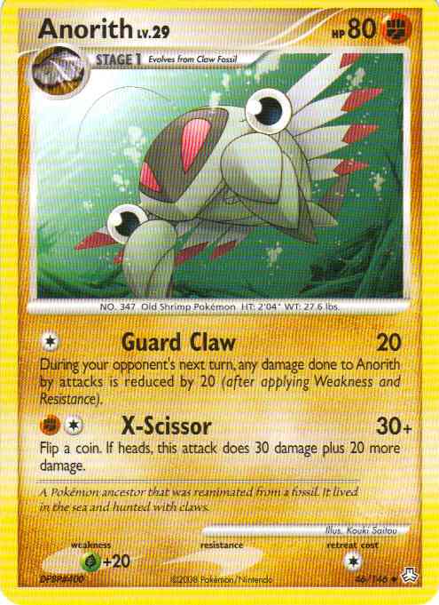 Type | Fighting | Pokemon serie | Legends Awakened | Stadie | Stage 1 | HP | 80.0 | Sjældenhed | Uncommon | Tilbagetrækning | 1.0 | Svaghed | G+20 | Kortnummer | 46 | Evne | [C] Guard Claw (20) During your opponent's next turn, any damage done to Anorith by attacks is reduced by 20 (after applying Weakness and Resistance). [CF] X-Scissor (30+) Flip a coin. If heads, this attack does 30 damage plus 20 more damage.