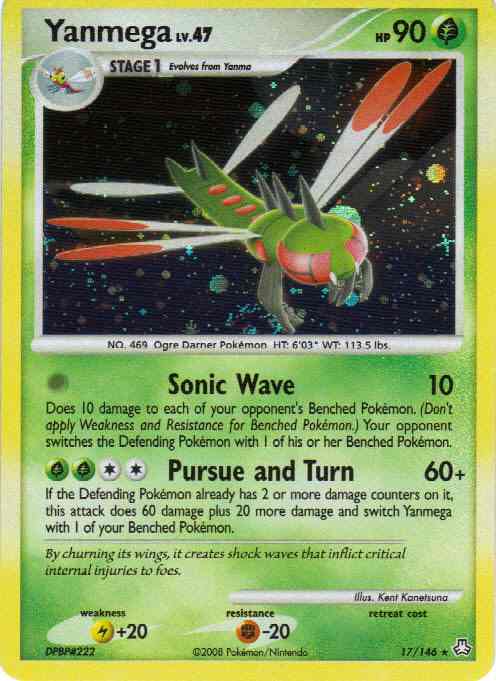 Type | Grass | Pokemon serie | Legends Awakened | Stadie | Stage 1 | HP | 90.0 | Sjældenhed | Rare | Tilbagetrækning | 0.0 | Modstand | F-20 | Svaghed | L+20 | Kortnummer | 17 | Evne | [0] Sonic Wave (10) Does 10 damage to each of your opponent's Benched Pokemon. (Don't apply Weakness and Resistance for Benched Pokemon.) Your opponent switches the Defending Pokemon with 1 of his or her Benched Pokemon. [CCGG] Pursue and Turn (60+) If the Defending Pokemon already has 2 or more damage counters on it, this attack does 60 damage plus 20 more damage and switch Yanmega with 1 of your Benched Pokemon.