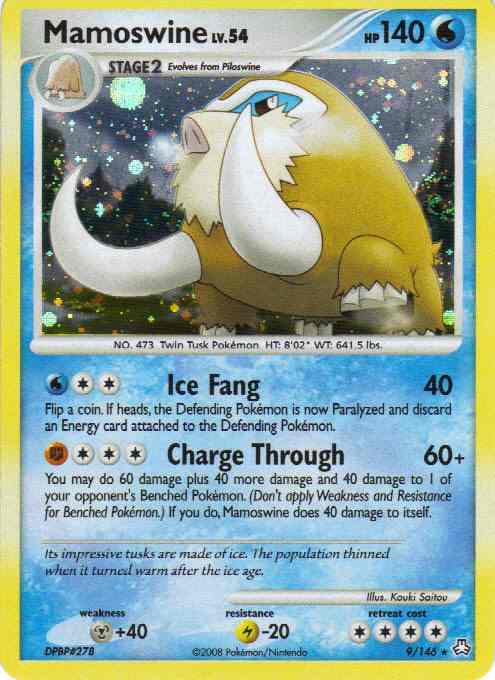 Type | Water | Pokemon serie | Legends Awakened | Stadie | Stage 2 | HP | 140.0 | Sjældenhed | Rare | Tilbagetrækning | 4.0 | Modstand | L-20 | Svaghed | M+40 | Kortnummer | 9 | Evne | [CCW] Ice Fang (40) Flip a coin. If heads, the Defending Pokemon is now Paralyzed and discard an Energy card attached to the Defending Pokemon. [CCCF] Charge Through (60+) You may do 60 damage plus 40 more damage and 40 damage to 1 of your opponent's Benched Pokemon. (Don't apply Weakness and Resistance for Benched Pokemon.) If you do, Mamoswine does 40 damage to itself.