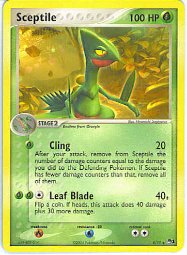 Type | Grass | Pokemon serie | OP Series 1 | Stadie | Stage 2 | HP | 100 | Sjældenhed | Rare | Tilbagetrækning | 2 | Modstand | W | Svaghed | R | Kortnummer | 4 | Evne | [G] Cling (20) After your attack, remove from Sceptile the number of damage counters equal to the damage you did to the Defending Pokemon. If Sceptile has fewer damage counters than that, remove all of them. [CGG] Leaf Blade (40+) Flip a coin. If heads, this attack does 40 damage plus 30 more damage.