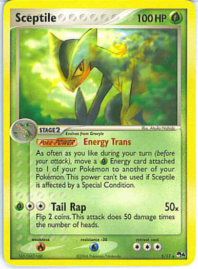 Type | Grass | Pokemon serie | OP Series 4 | Stadie | Stage 2 | HP | 100 | Sjældenhed | Rare | Tilbagetrækning | 3 | Modstand | W | Svaghed | R | Kortnummer | 5 | Evne | [CCG] Tail Rap (50x) Flip 2 coins. This attack does 50 damage times the number of heads.