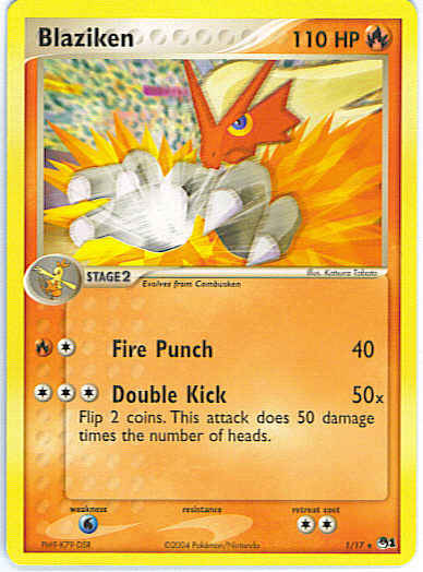 Type | Fire | Pokemon serie | OP Series 1 | Stadie | Stage 2 | HP | 110 | Sjældenhed | Rare | Tilbagetrækning | 2 | Svaghed | W | Kortnummer | 1 | Evne | [CR] Fire Punch (40) [CCC] Double Kick (50x) Flip 2 coins. This attack does 50 damage times the number of heads.