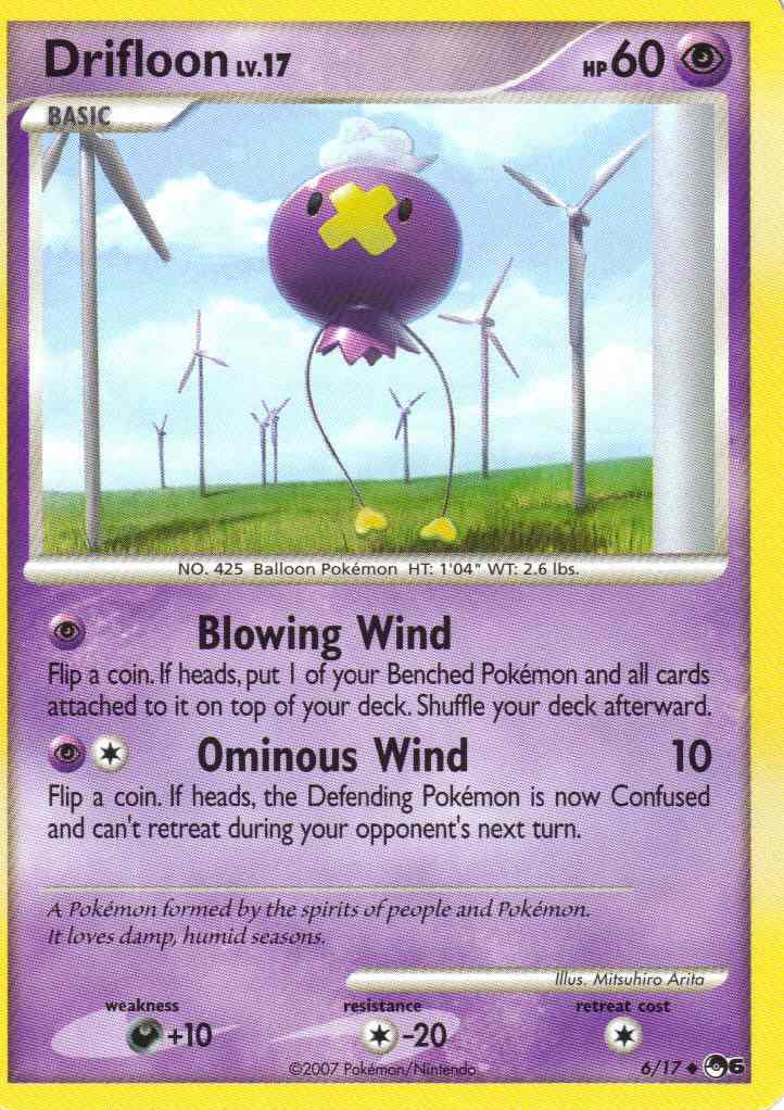 Type | Psychic | Pokemon serie | OP Series 6 | Stadie | Basic | HP | 60 | Sjældenhed | Uncommon | Tilbagetrækning | 1 | Modstand | C-20 | Svaghed | D+10 | Kortnummer | 6 | Evne | [P] Blowing Wind - Flip a coin. If heads, put 1 of your Benched Pokemon and all cards attacked to on top of your deck. Shuffle your deck afterward. [CP] Ominous Wind (10) Flip a coin. If heads, the Defending Pokemon is now Confused and can't retreat during your opponent's next turn.