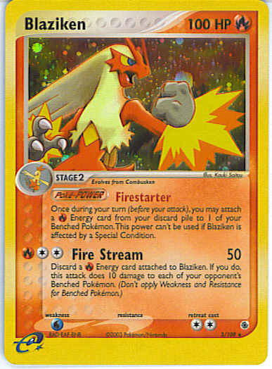 Type | Fire | Pokemon serie | Ruby Sapphire | Stadie | Stage 2 | HP | 100 | Sjældenhed | Rare | Tilbagetrækning | 2 | Svaghed | W | Kortnummer | 3 | Evne | [CCR] Fire Stream (50) Discard a R Energy card attached to Blaziken. If you do, this attack does 10 damage to each of your opponent's Benched Pokemon. (Don't apply Weakness and Resistance for Benched Pokemon.)