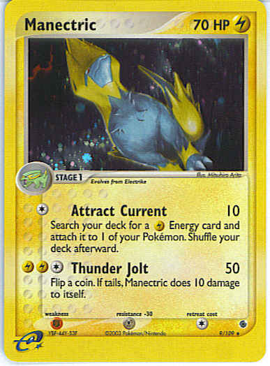 Type | Lightning | Pokemon serie | Ruby Sapphire | Stadie | Stage 1 | HP | 70 | Sjældenhed | Rare | Tilbagetrækning | 1 | Modstand | M | Svaghed | F | Kortnummer | 9 | Evne | [C] Attract Current (10) Search your deck for a L Energy card and attach it to 1 of your Pokemon. Shuffle your deck afterward. [CLL] Thunder jolt (50) Flip a coin. If tails, Manectric does 10 damage to itself.