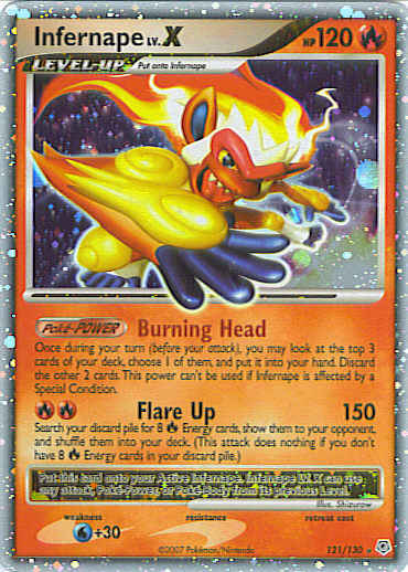Type | Fire | Pokemon serie | Diamond and Pearl | Stadie | Level Up | HP | 120 | Sjældenhed | Ultra-Rare | Svaghed | W+30 | Kortnummer | 121 | Evne |