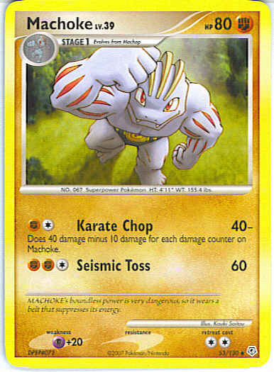 Type | Fighting | Pokemon serie | Diamond and Pearl | Stadie | Stage 1 | HP | 80 | Sjældenhed | Uncommon | Tilbagetrækning | 2 | Svaghed | P+20 | Kortnummer | 53 | Evne |