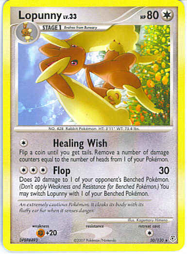 [CCC] Flop (30) Does 20 damage to 1 of your opponent's Benched Pokemon. (Don't apply Weakness and Resistance for Benched Pokemon.) You may switch Lopunny with 1 of your Benched Pokemon.