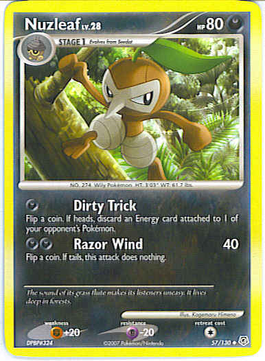 Type | Darkness | Pokemon serie | Diamond and Pearl | Stadie | Stage 1 | HP | 80 | Sjældenhed | Uncommon | Tilbagetrækning | 1 | Modstand | P-20 | Svaghed | F+20 | Kortnummer | 57 | Evne |