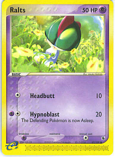 Type | Psychic | Pokemon serie | Ruby Sapphire | Stadie | Basic | HP | 50 | Sjældenhed | Common | Tilbagetrækning | 1 | Svaghed | P | Kortnummer | 67 | Evne | [C] Headbutt (10) [CP] Hypnoblast (20) The Defending Pokemon is now Asleep.
