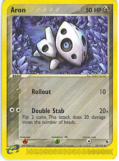 Type | Metal | Pokemon serie | Ruby Sapphire | Stadie | Basic | HP | 50 | Sjældenhed | Uncommon | Tilbagetrækning | 1 | Svaghed | R | Kortnummer | 25 | Evne | [M] Rollout (10) [CC] Double Stab (20x) Flip 2 coins. This attack does 20 damage times the number of heads.