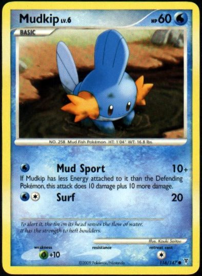 Evne [W] Mud Sport (10+) If Mudkip has less Energy attached to it than the Defending Pokemon, this attack does 10 damage plus 10 more damage.