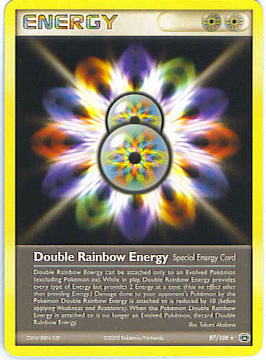 Evne Double Rainbow Energy can be attached only to an Evolved Pokemon (excluding Pokemon-ex). While in play, Double Rainbow Energy provides every type of Energy but provides 2 Energy at a time. (Doesn't count as a basic Energy when not in play and has no effect other than providing Energy.) Damage done to your opponent's Pokemon by the Pokemon Double Rainbow Energy is attached to is reduced by 10 (after applying Weakness and Resistance). When the Pokemon Double Rainbow Energy is attached to is no longer an Evolved Pokemon, discard Double Rainbow Energy.