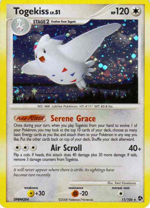 Evne [CCC] Air Scroll (40+) Flip a coin. If heads, this attack does 40 damage plus 30 more damage. If tails, remove 3 damage counters from Togekiss.