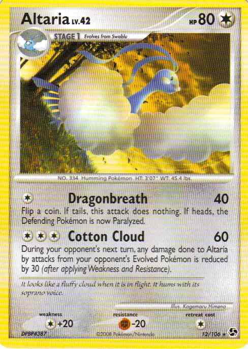 Type | Colorless | Pokemon serie | Great Encounters | Stadie | Stage 1 | HP | 80.0 | Sjældenhed | Rare | Tilbagetrækning | 1.0 | Modstand | F-20 | Svaghed | C+20 | Kortnummer | 12 | Evne | [C] Dragonbreath (40) Flip a coin. If tails, this attack does nothing. If heads, the Defending Pokemon is now Paralyzed. [CCC] Cotton Cloud (60) During your opponent's next turn, any damage done to Altaria by attacks from your opponent's Evolved Pokemon is reduced by 30 (after applying Weakness and Resistance).