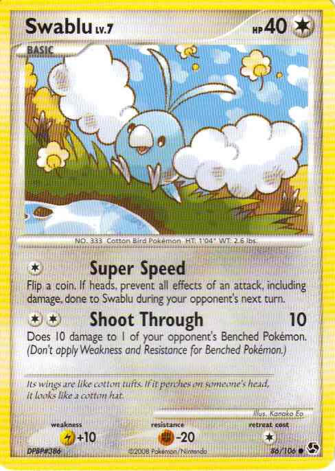 Evne2 [C] Super Speed - Flip a coin. If heads, prevent all effects of an attack, including damage, done to Swablu during your opponent's next turn.
