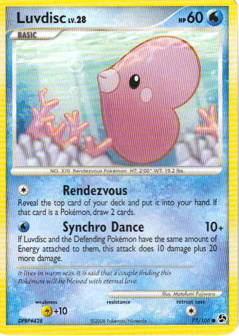 [W] Synchro Dance (10+) If Luvdisc and the Defending Pokemon have the same amount of Energy attached to them, this attack does 10 damage plus 20 more damage.