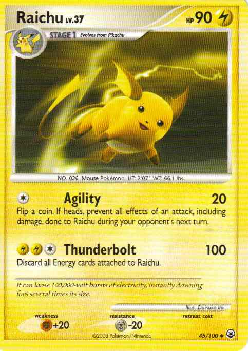 Evne2 [C] Agility (20) Flip a coin. If heads, prevent all effects of an attack, including damage, done to Raichu during your opponent's next turn.