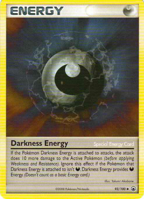 Evne If the Pokemon Darkness Energy is attached to attacks, the attack does 10 more damage to the Active Pokemon (before applying Weakness and Resistance). Ignore this effect if the Pokemon that Darkness Energy is attached to isn't Dark. Darkness Energy provides D Energy. (Doesn't count as a basic Energy card.) (Major text change in Ruby/Sapphire. Using earlier versions requires reference.)