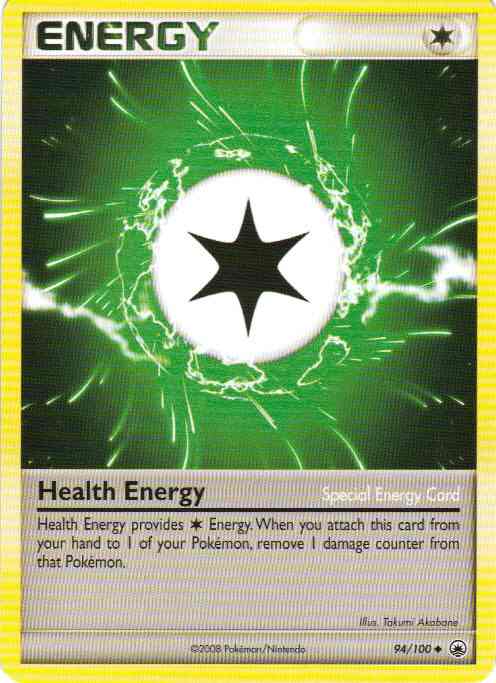Health Energy provides C Energy. When you attach this card from your hand to 1 of your Pokemon, remove 1 damage counter from that Pokemon.