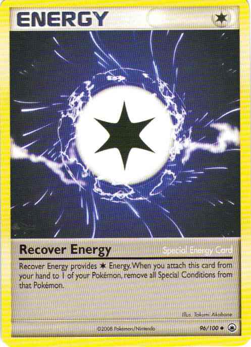 Recover Energy provides C Energy. When you attach this card from your hand to 1 of your Pokemon, remove all Special Conditions from that Pokemon.