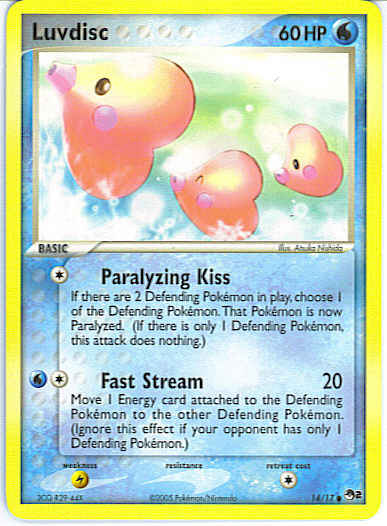 Type | Water | Pokemon serie | OP Series 2 | Stadie | Basic | HP | 60 | Sjældenhed | Common | Tilbagetrækning | 1 | Svaghed | L | Kortnummer | 14 | Evne | [C] Paralyzing Kiss - If there are 2 Defending Pokemon in play, choose 1 of the Defending Pokemon. That Pokemon is now Paralyzed. (If there is only 1 Defending Pokemon, this attack does nothing.) [CW] Fast Stream (20) Move 1 Energy card attached to the Defending Pokemon to the other Defending Pokemon. (Ignore this effect if your opponent has only 1 Defending Pokemon.)