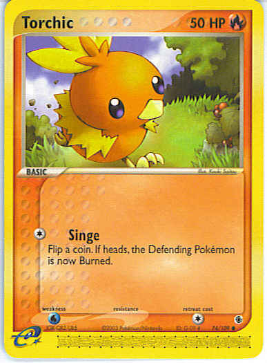 Type | Fire | Pokemon serie | Ruby Sapphire | Stadie | Basic | HP | 50 | Sjældenhed | Common | Tilbagetrækning | 1 | Svaghed | W | Kortnummer | 74 | Evne | [C] Singe - Flip a coin. If heads, the Defending Pokemon is now Burned.