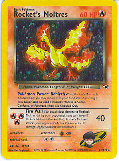 Evne [RRR] Fire Wall (40) If an attack does damage to Rocket's Moltres during your opponent's next turn (even if Rocket's Moltres is Knocked Out), Rocket's Moltres attacks your opponent's Active Pokemon for 10 damage. (Apply Weakness and Resistance.)