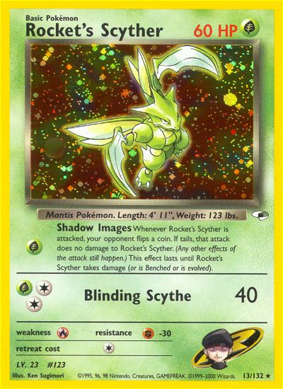 Evne [G] Shadow Images - Whenever Rocket's Scyther is attacked, your opponent flips a coin. If tails, that attack does no damage to Rocket's Scyther. (Any other effects of the attack still happen.) This effect lasts until Rocket's Scyther takes damage (or is Benched or is evolved).